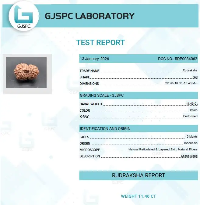 15 Mukhi Rudraksha – Indonesia Origin The 15 Mukhi Rudraksha pacifies malefic Mercury (Budha) and activates the Anahata (Heart) Chakra, the seat of emotions. It enhances memory, intuition, and communication skills, ensuring success in examinations and life. This bead attracts positive influences and blocks negative ones, promoting emotional stability and happiness. Blessed by Devi Shodashi, it is also effective in managing heart, lung, and liver-related diseases.