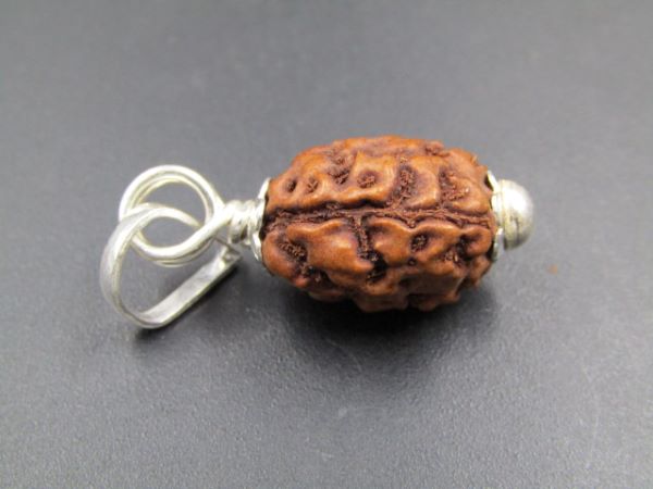 - Smaller and oval-shaped bead with three fine, visible natural mukhi lines.