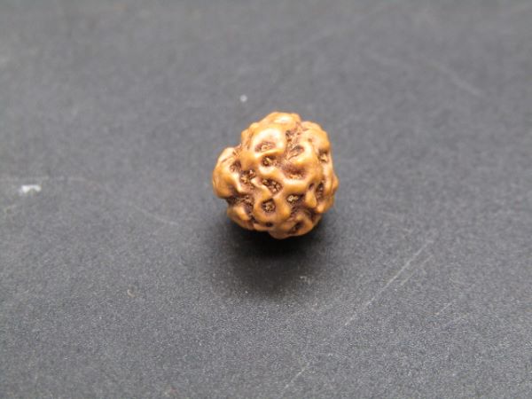 - Smaller and oval-shaped bead with three fine, visible natural mukhi lines.